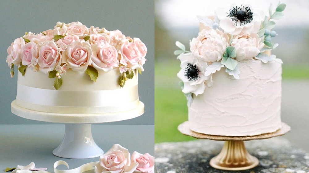 Chiếc bánh cưới một tầng được phủ lớp kem trắng mịn, tạo nền cho những bông hoa hồng nhạt đầy thanh thoát. Hoa hồng nhạt có thể được trang trí theo nhiều cách: từ những bông hoa nở rộ ở đỉnh bánh, lan tỏa xuống các cạnh, hoặc trải dài theo một bên, mang lại sự mềm mại, duyên dáng. Màu hồng nhạt biểu trưng cho tình yêu nhẹ nhàng, sự lãng mạn và niềm hy vọng về một cuộc sống hôn nhân ngọt ngào, hạnh phúc.