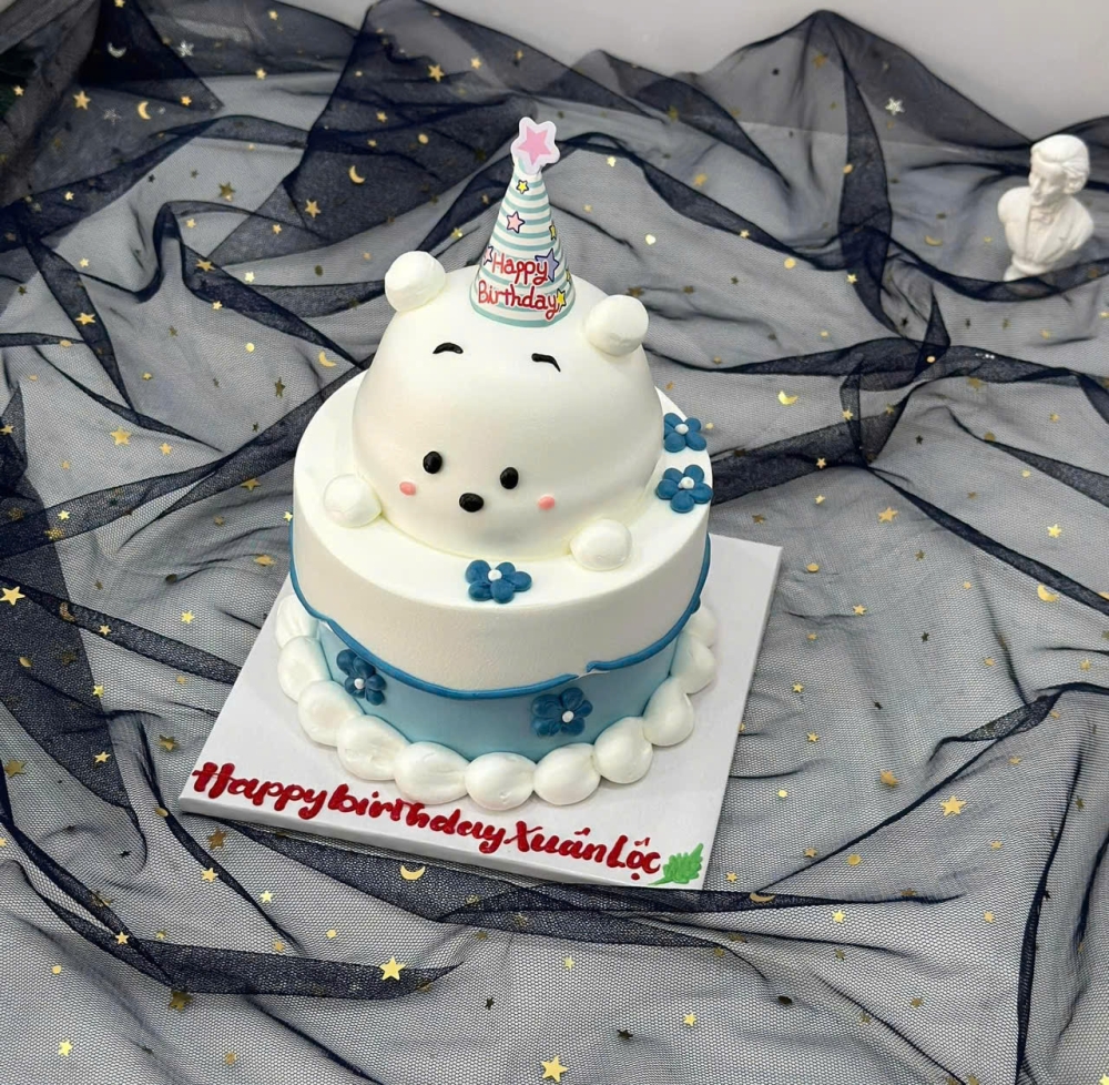 Chiếc bánh được tạo hình như một chú gấu trắng với đôi má ửng hồng, toát lên vẻ ngộ nghĩnh và dễ thương. Chú gấu đội chiếc mũ sinh nhật nhỏ xinh, kết hợp cùng những bông hoa xanh xung quanh, tạo nên một tổng thể trang nhã nhưng không kém phần vui tươi. Chi tiết này khiến chiếc bánh trở nên vô cùng sống động và đáng yêu, hoàn hảo cho các bữa tiệc sinh nhật.