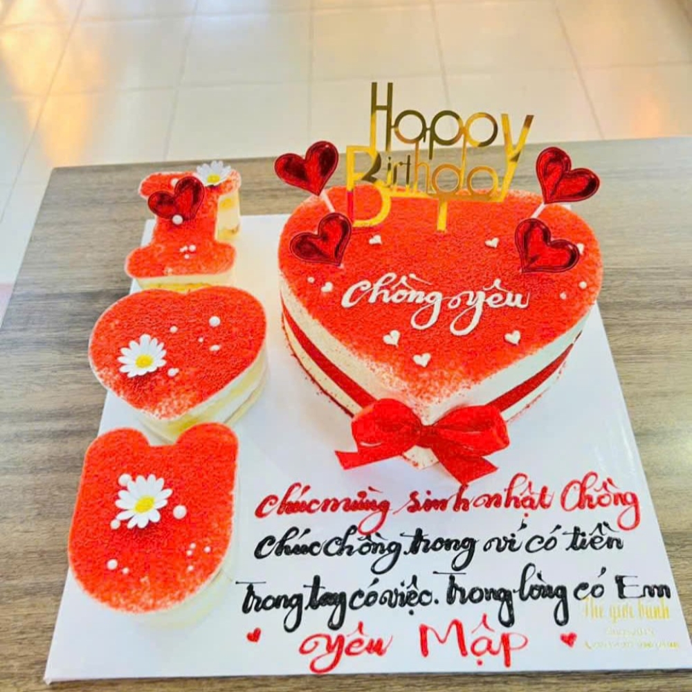 Chiếc bánh được tạo hình trái tim rực rỡ với sắc đỏ chủ đạo, tượng trưng cho tình yêu mãnh liệt. Trang trí nơ đỏ duyên dáng, những chi tiết nhỏ như trái tim mini, và dòng chữ “Chồng yêu” nổi bật trên mặt bánh mang lại cảm giác hạnh phúc và ấm áp.
